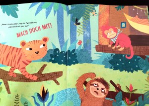 Aber neben diesen ganzen kleinen Attraktionen ist die hilfreiche Botschaft: Teile deine Wut, denn es gibt auch noch andere, die ziemlich wütend sind. Wenn man mit anderen darüber spricht, schafft man es, die bescheuerte Wut zu verjagen. Das ist im Buch toll umgesetzt: Auch das Faultier ist sauer – es hat nämlich zu Beginn der Geschichte eine Banane an den Kopf bekommen. Von wem die wohl war? Und woher kommt dann die Kokosnuss, die Affe Wim auf den Kopf fällt?