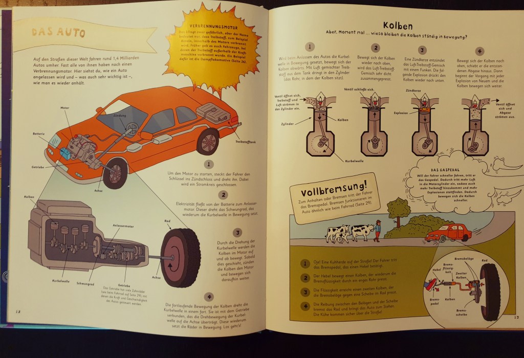 Ich habe durch dieses Buch jetzt endlich mal die Funktionsweise vieler Fahrzeuge verstanden, was mein damaliger Schulunterricht nie hinbekommen hat. Und ich weiß jetzt auch, dass U-Boote ihr Gewicht verändern und auf diese Weise ab- und auftauchen können. Und ein paar großartige neue Wörter habe ich auch entdeckt: „Bremsbacke“, „Kurbelgarnitur“ und „Kettenblatt“. Na, wisst ihr, woher sie kommen?