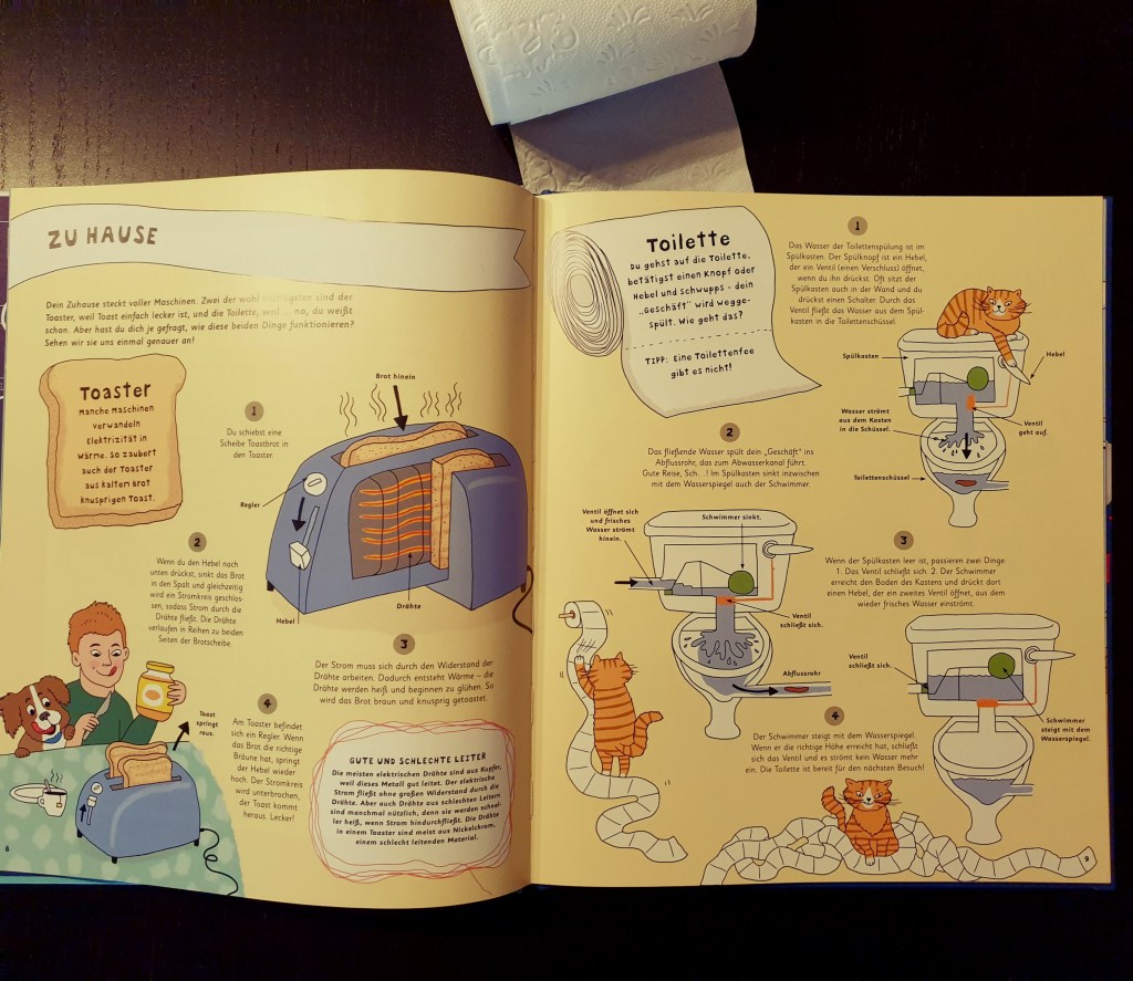 Dieses Sachbuch über die Funktionsweisen von so ziemlich allem startet ganz langsam. Es nimmt sich im Kapitel „Zu Hause“ ganz simpel erst einmal Toaster und Toilette vor. Erst dann kommen komplexe Themen wie zum Beispiel „Windräder und Gezeitenkraftwerk“ oder „Röntgenapparat und Mikroskop“ an die Reihe. Insgesamt gibt es zwanzig solcher Themenbereiche. Da geht es vom Auto über Kühlgeräte zu Robotern. Klingt erst einmal öde, ist es aber überhaupt nicht!