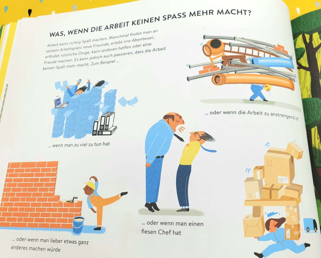 Auch die nicht so schönen Aspekte von Arbeit werden beleuchtet. Arbeit kann einen Menschen ziemlich traurig machen, wenn sie zu anstrengend ist, die Kollegen*innen fies zu einem sind, man plötzlich gefeuert wird oder wenn man einfach schon sein Leben lang von einer ganz anderen Beschäftigung träumt.
