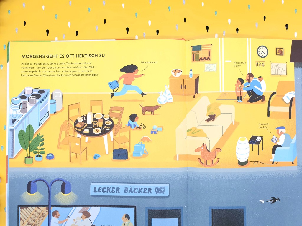 Und dann ist da noch eine Arbeit, die im Hintergrund passiert, häufig aber immer noch nicht als richtige Arbeit eingestuft wird. Man kann sie ebenfalls nicht anhand eines einzigen Bildes beschreiben und die Gestaltung ist deshalb in vielen (hektischen) Situationen abgebildet. Die Kinder bekommen ein Gefühl dafür, was es heißt, auch im Hintergrund zu sein und rund um die Uhr etwas zu tun zu haben. Und sie erkennen sich natürlich in den Kindern wieder, die überall mit dabei sind.