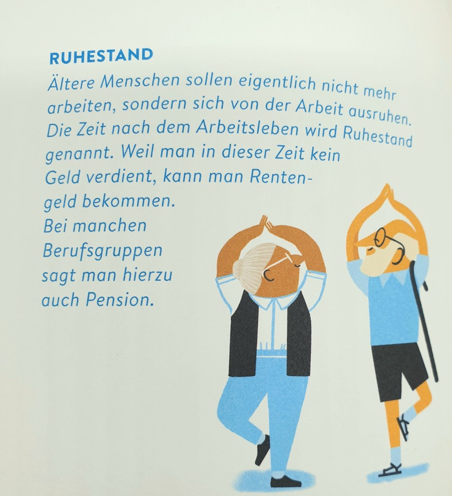 Witzig und ein gelungener Abschluss ist, dass auf der letzten Seite noch typische Ausdrücke zum Thema Arbeit zu sehen sind, die mitunter im Bild sogar wörtlich dargestellt werden wie „einen Job an den Nagel hängen“ oder „Ruhestand“.